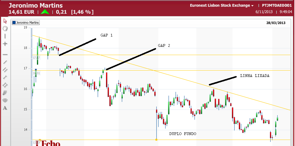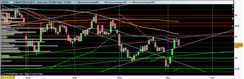 Parece que dos companheiros de viagem só sobro eu, os outros já se apearam. Ontem tudo estava a correr bem, com muita pressão compradora e o preço a subir para próximo dos 15€, até que saíram notícias do outro lado do Atlântico e comais uma vez com a história da FED as bolsas bolsas afundaram. A JM até caiu pouco comparada com a média, a verdade é que onda compradora se esfumou. Hoje já era esperado, começou com os stops a serem accionados em dominó e investidores a realizar mais valias. Tudo isto num dia péssimo para o PSI. Vamos ver se quando a bolsa animar para a semana a JM entra definitivamente numa onda bull.