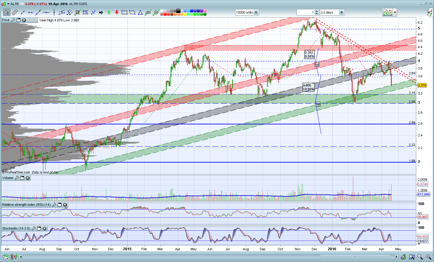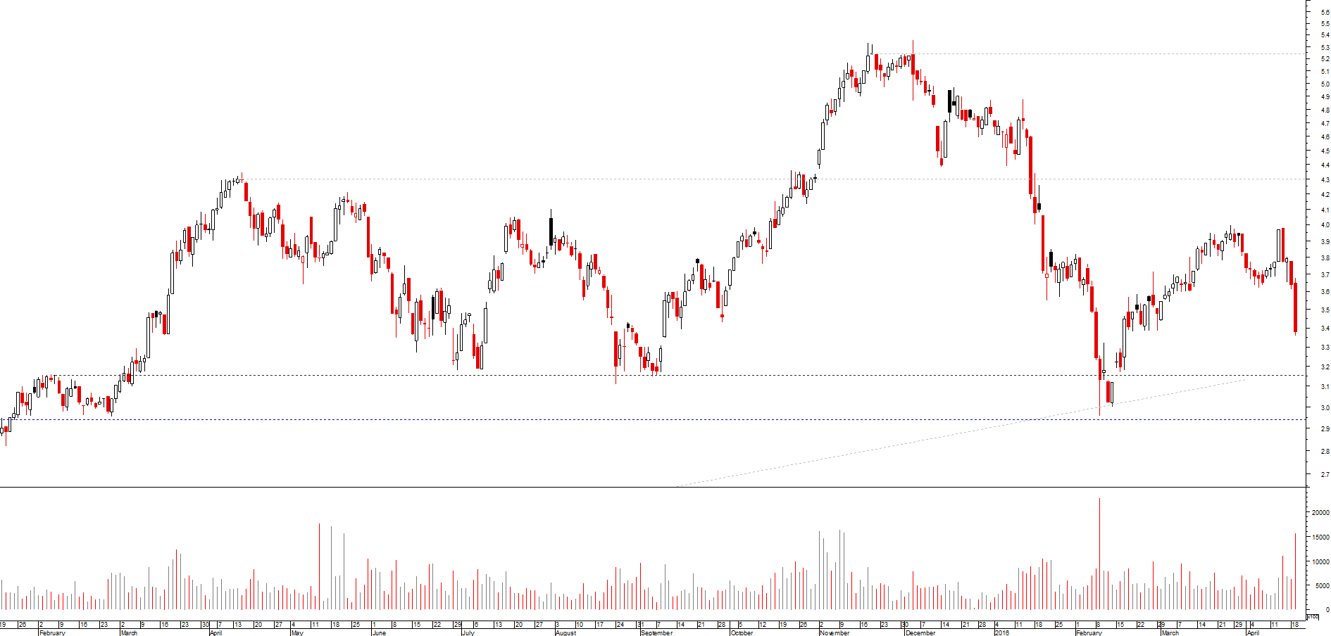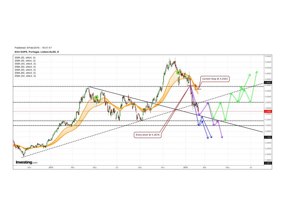 Bem, mais um dia e mais uma valente queda de ~7% ! A cotação fechou abaixo da linha de tendência que vinha dos máximos de Abril de 2015 e com bastante momento descendente. Creio que eventualmente deverá sobrer algum atrito na área dos 3-3.16 euros (zona de suporte/resistencia), e poderá voltar a testar a linha de tedência de Abril de 2015. Mas creio que superadas esta zona, vai ser sempre a descer até ~2.5 euros.