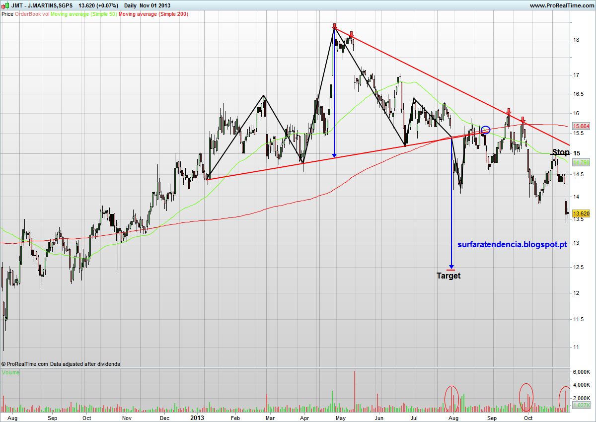 Todas estas análises são válidas, para mim são mais uma razão para manter a acção sob vigilancia apertada. Desta vez entrei a 13.600 e enquanto os 13.500 não forem quebrados não vejo razões para preocupação, O RSI e stochastic estão de novo a chegar a minimos, temos um gap de 69 centimos para fechar, 11 milhões de dividendos a entrar este mês e no próximo, um trimestre que costuma ser bom para o retalho com as festas de fim de ano, e como diz o momenta um salto por cima da velha LTD. O cenário de fundo duplo nesta conjuntura não me parece provável, para ser confirmado tem que quebrar a neckline que se encontra nos 16€. Estou optimista para a semana. Como isto é uma espécie de peer reviewed trading digam de vossa justiça, isto é apenas a minha opinião.