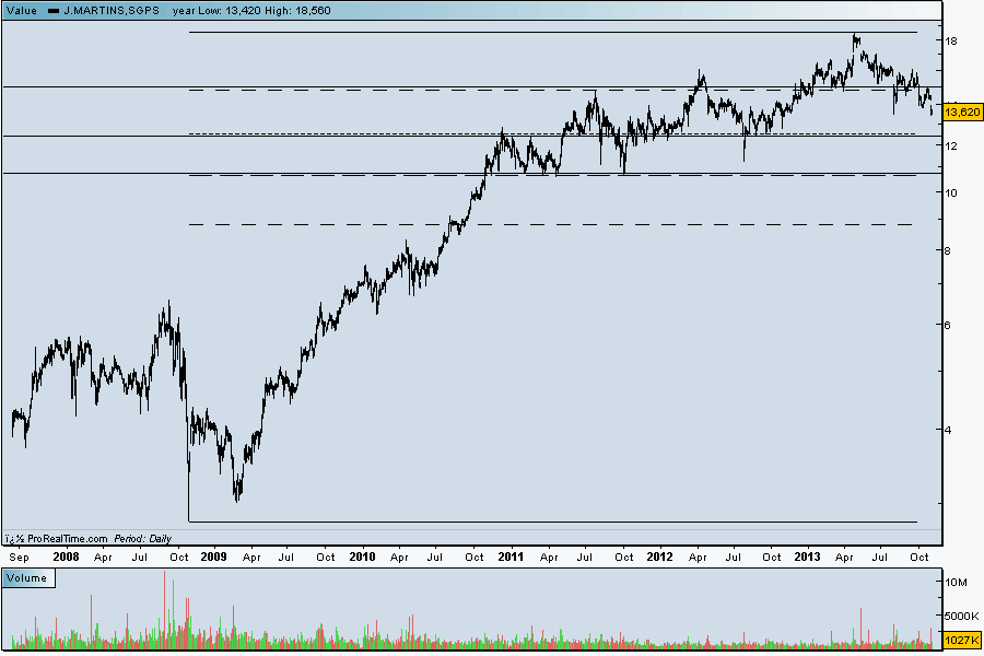 m05h Escreveu:Todas estas análises são válidas, para mim são mais uma razão para manter a acção sob vigilancia apertada. Desta vez entrei a 13.600 e enquanto os 13.500 não forem quebrados não vejo razões para preocupação, O RSI e stochastic estão de novo a chegar a minimos, temos um gap de 69 centimos para fechar, 11 milhões de dividendos a entrar este mês e no próximo, um trimestre que costuma ser bom para o retalho com as festas de fim de ano, e como diz o momenta um salto por cima da velha LTD. O cenário de fundo duplo nesta conjuntura não me parece provável, para ser confirmado tem que quebrar a neckline que se encontra nos 16€. Estou optimista para a semana. Como isto é uma espécie de peer reviewed trading digam de vossa justiça, isto é apenas a minha opinião.