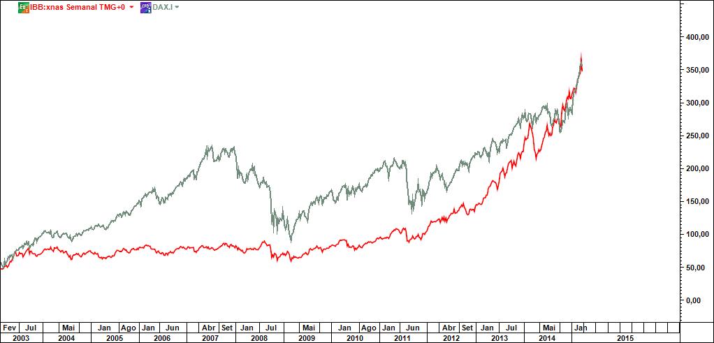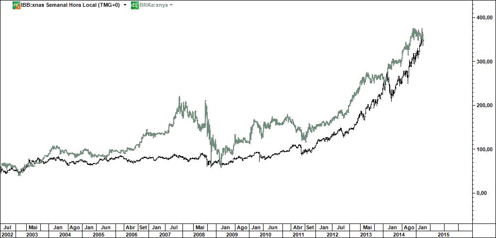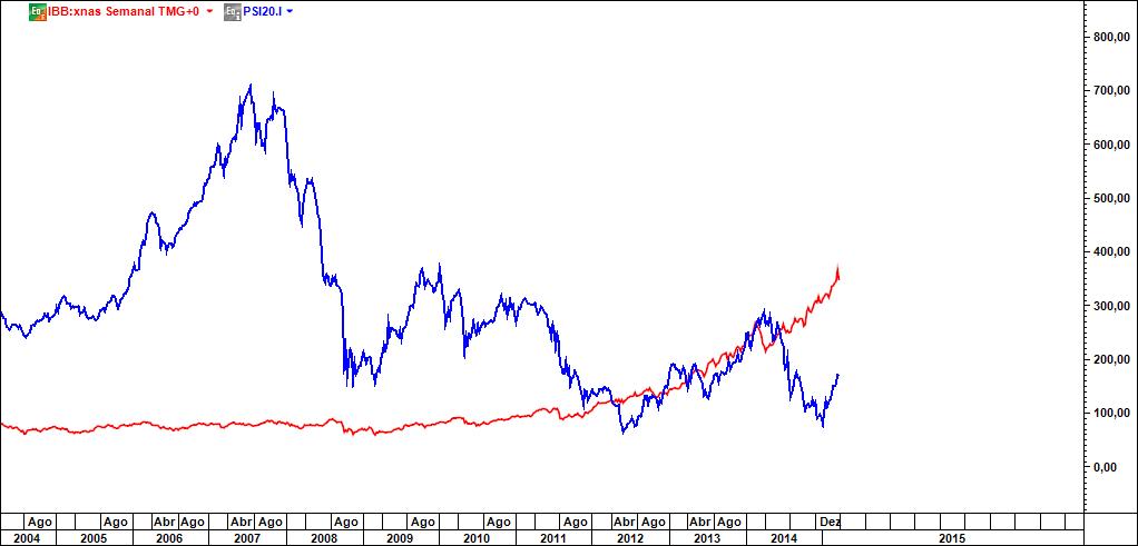 O Alquimista Escreveu:Quatro gráficos semanais: o 1º comparando IBB com PSI20, o 2º comparando IBB com DAX, o 3º comparando IBB com BRKa e o 4º comparando IBB com SP500. Qual deles o mais perigoso? Mera pergunta de retórica e dispenso-me de fazer comentários.