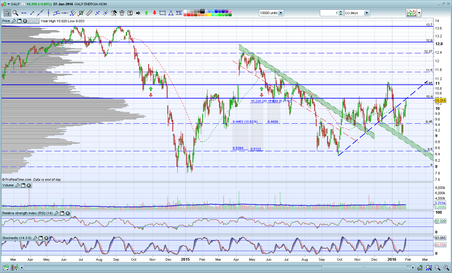 Pois, eu estou a prever uma queda ate aos 9,40 mais pelo receio da economia chinesa, pelo o Executivo de Dilma e o pacote de medidas de estímulo até ao fim do mês e este dumping da OPEP que não ha meio de acabar, apesar de quando se compara o grafico do brent ao da cotacao da Galp, o comportamento da Galp não é igual. Provavelmente vou esperar durante esta semana a ver o comportamento.