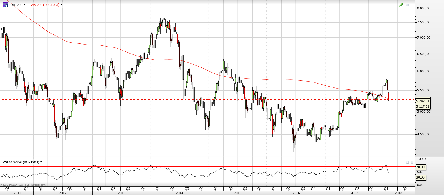 Deixei a minha opinião sobre o PSI no artigo que publiquei ontem, mas deixo aqui os gráficos actualizados. Era importante para os touros ganharem de novo o controlo do curto prazo que recuperassem a zona dos 5500 euros (estou a falar de uma zona, não de um ponto isolado), enquanto isso não acontece há um equilíbrio no curto prazo. Em termos de médio e longo prazo, como tenho frisado, o domínio continua a ser incontestado enquanto não quebrar os 5050.