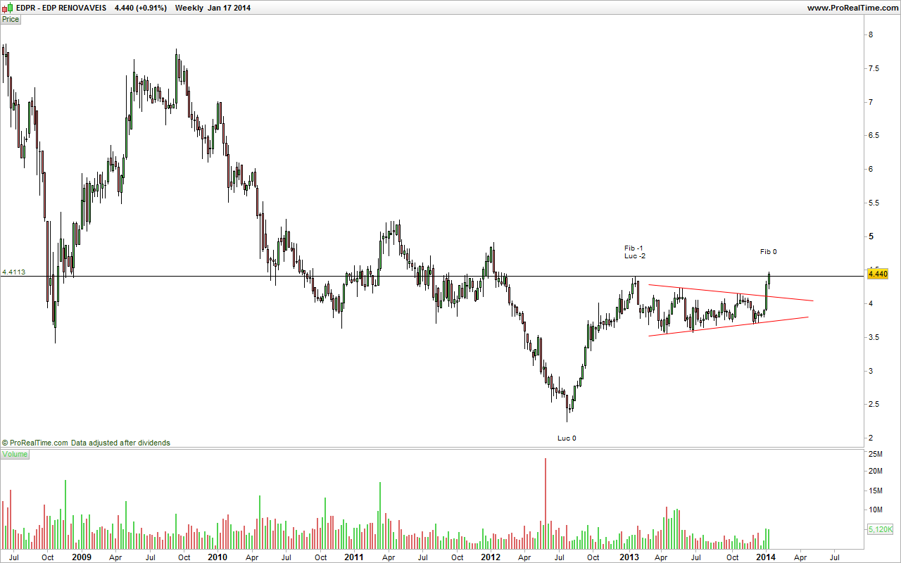 A EDPR parece ter formado uma base no ano 2013 e está prestes a quebrar os 4,43 no semanal (Máx, JAN/13), efectuando um breakout swing: