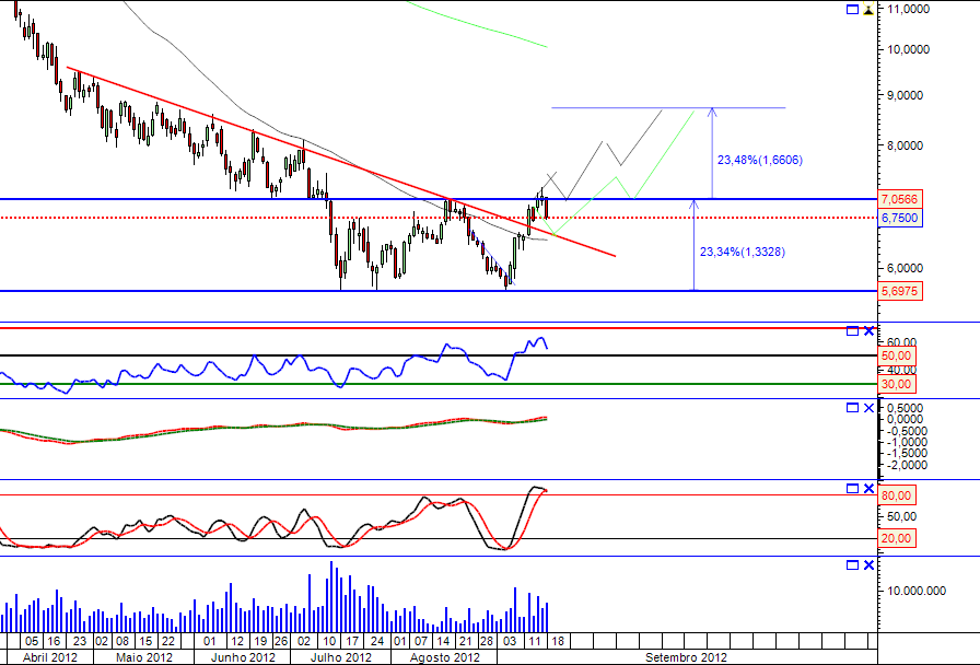 No 2º cenário, ou seja no reteste à LTd uma entrada também me parece interessante, porém existe o "fantasma" de este movimento não passar de uma laterelização no range 5,70 a 7,05, como o Elias sugeriu na página anterior. E não esquecer da tendência negativa, pesada, de médio e longo prazo.