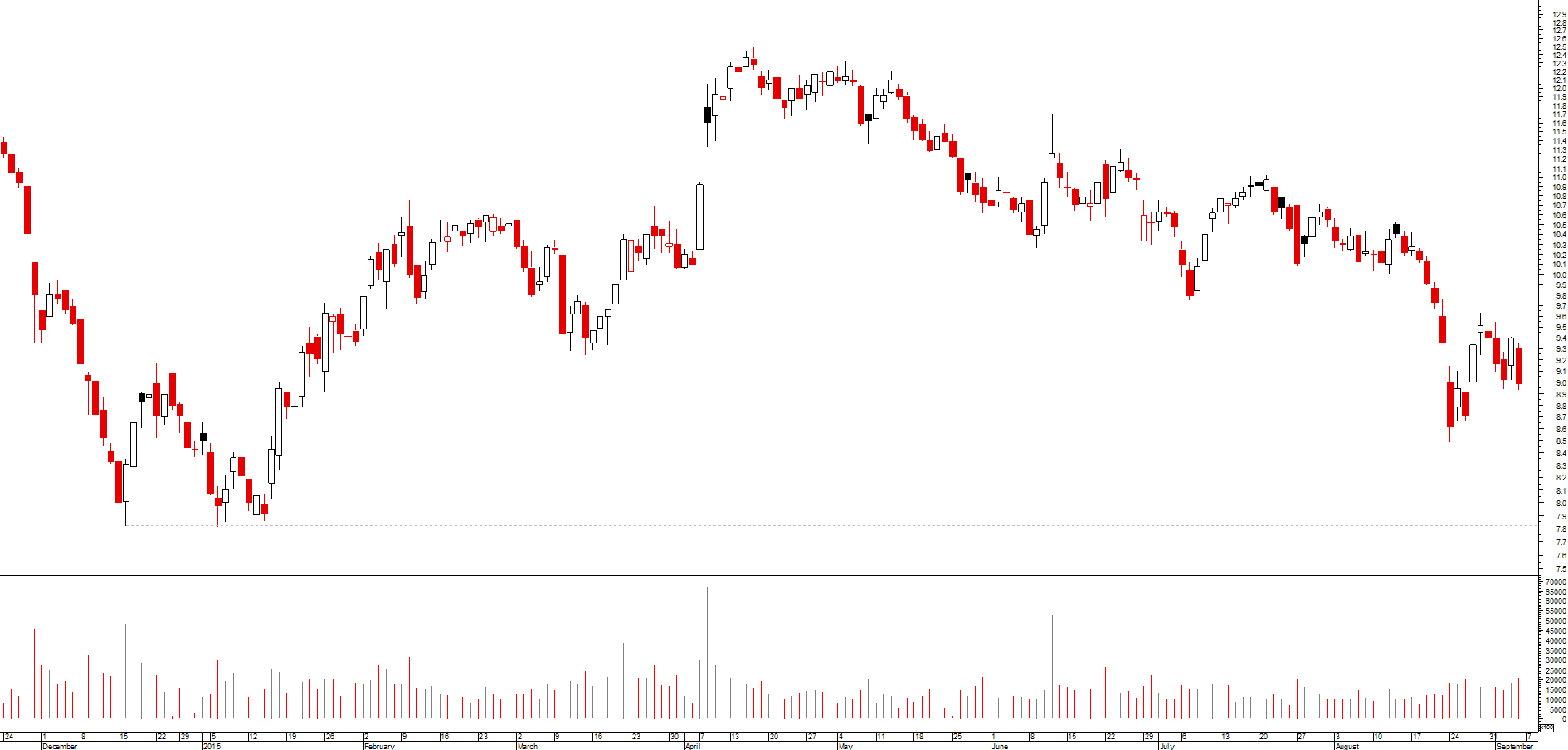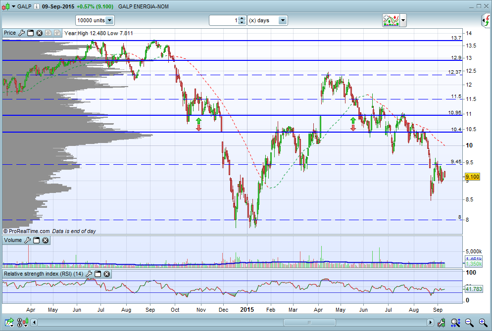 Neste momento como está a tocar a base do canal descendente, e no pequeno suporte dos 9,30, poderá ter algum pequeno ressalto , mas enquanto não sair deste canal descendente bem definido , não vejo mais que um ressalto.
