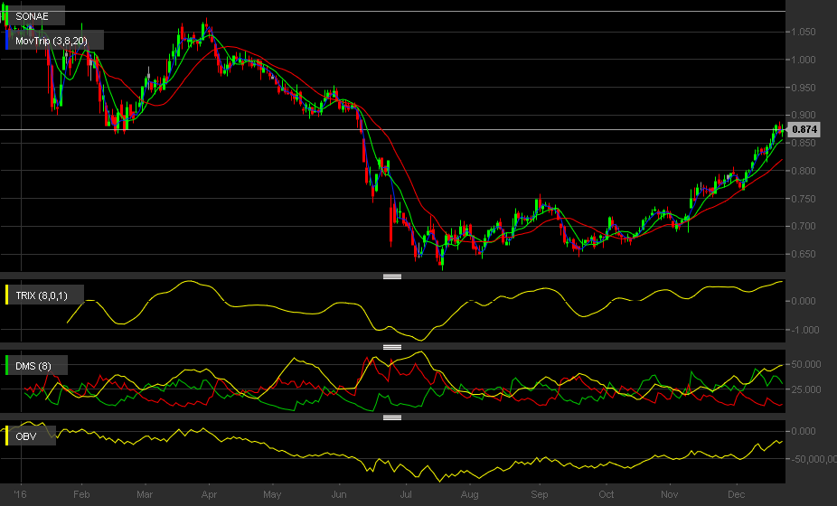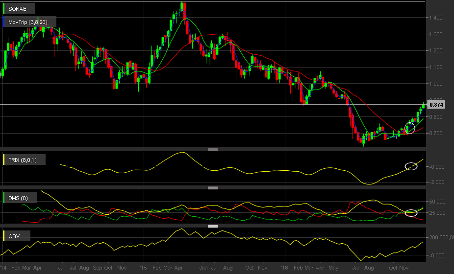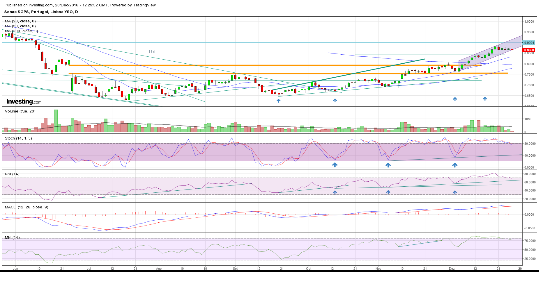 Aqui a sonae tornou-se bullish no medio prazo desde os 0.75€,como assinalado no grafico,nao dá neste momento para falar de venda(ainda),apesar de ter chegado no alvo e fechado um anterior gap na zona dos 0.86€ o que poderá causar alguma resistencia ou retração.Um gap na casa dos 0.65€ ficou por fechar pelo que acredito que iremos lá em baixo novamente,até lá,teremos que esperar confirmaçao dos indicadores e nao pensar sequer em vendas