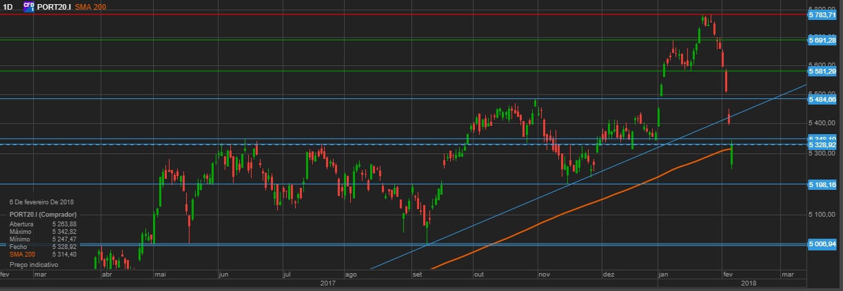 Sinceramente estou com algumas dúvidas quanto à "salubridade" destas correcções a nível mundial. No PSI, era bom se hoje fechasse acima da MM200, de preferência na zona de suporte dos 5340. Quanto aos índices americanos, as quedas foram mesmo fortes. Para ter uma ideia, e havendo a percepção que o S&P estava esticado e a subir a pique, ontem à noite os futuros chegaram a um ponto em que em 3 dias anulavam os ganhos de 4 meses. Para não falar no VIX que está nos níveis do crash de 2008. Estamos a falar de uma correcção que atingiu mais de 11% em poucos dias, estando agora a recuperar e a fazer, caso se mantenha aos níveis actuais até ao fecho, uma vela bastante interessante. Mas voltando ao PSI, acho que o essencial é não quebrar em baixa os 5200 para não colocar, a meu ver, em causa o bull, mas um fecho acima da mm200 deixaria-me mais tranquilo em relação aos reforços que fiz hoje.