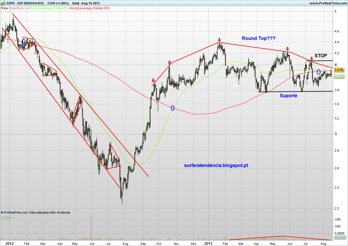 Se as cotações quebrarem em baixa o suporte, que actualmente se encontra nos 3,6€, o round top confirma-se e o potencial de queda numa zona sem qualquer suporte recente é muito significativo. A seguir-se a tendência de longo prazo, de lower-lows, poderemos mesmo caminhar para novos mínimos. Todo este cenário se inverte caso os actuais máximos sejam quebrados em alta, numa primeira fase os 4,07 e numa segunda fase os 4,23. As notícias de uma absorção da EDPR por parte da EDP (que será decidida até 2015) poderão regressar a qualquer momento, tornando a direcção da cotada certamente mais imprevisível. Para já estou curto e na expectativa, mas bastante despreocupado.