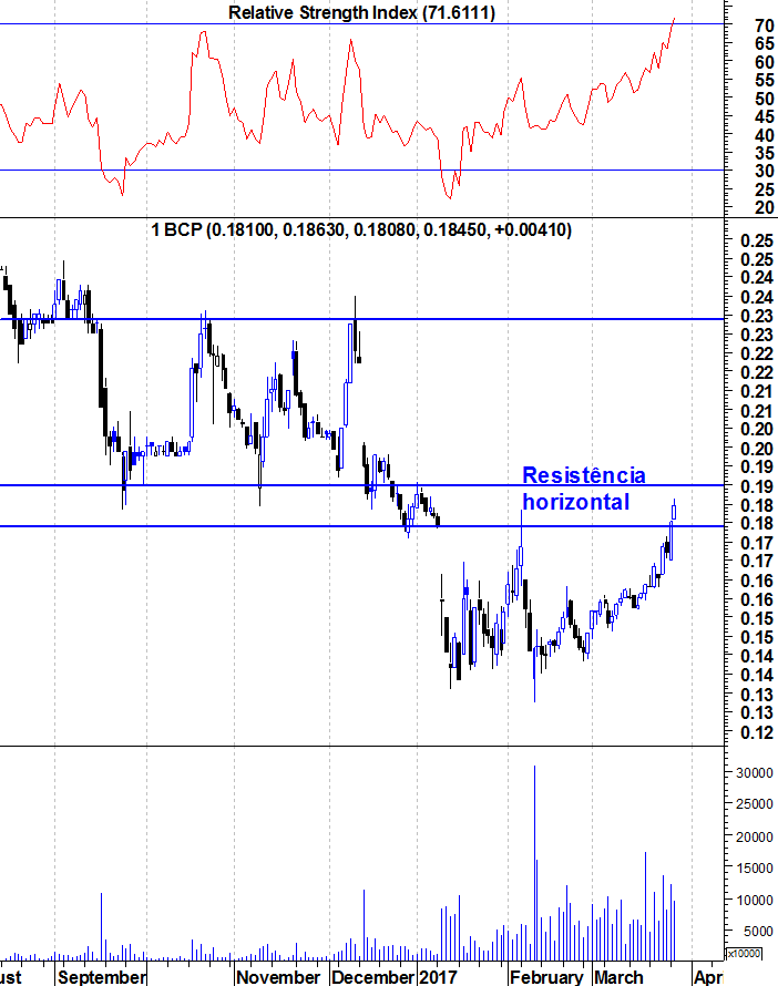 Aqui ficam os gráficos actualizados do BCP. Chegou à zona de resistência entre 0,18 e 0,19 euros, está "sobrecomprado", tem tudo para uma correcção de curto prazo acontecer.