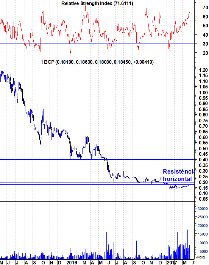 RogerR Escreveu:Ulisses Pereira Escreveu:Aqui ficam os gráficos actualizados do BCP. Chegou à zona de resistência entre 0,18 e 0,19 euros, está "sobrecomprado", tem tudo para uma correcção de curto prazo acontecer.