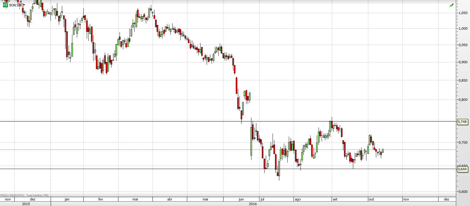 Gráfico diário em tendência descendente e em fase de consolidação/latealização