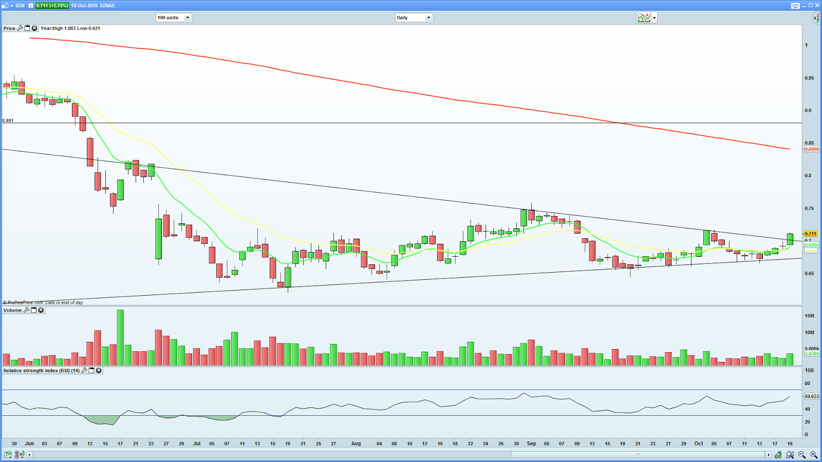 Entretanto, também se pode ver que há rompimento de uma Ltd que vem de março e sinal de compra de curto prazo dado pelas médias móveis. Para o médio prazo, diríamos que precisamos de um fecho acima dos 0,75€.
