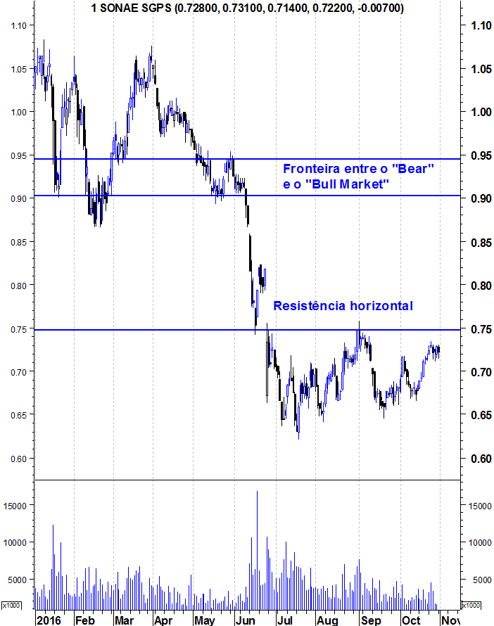 Aqui ficam os gráficos actualizados da Sonae SGPS. Os touros precisam de quebrar resistências para assumirem o controlo da acção.