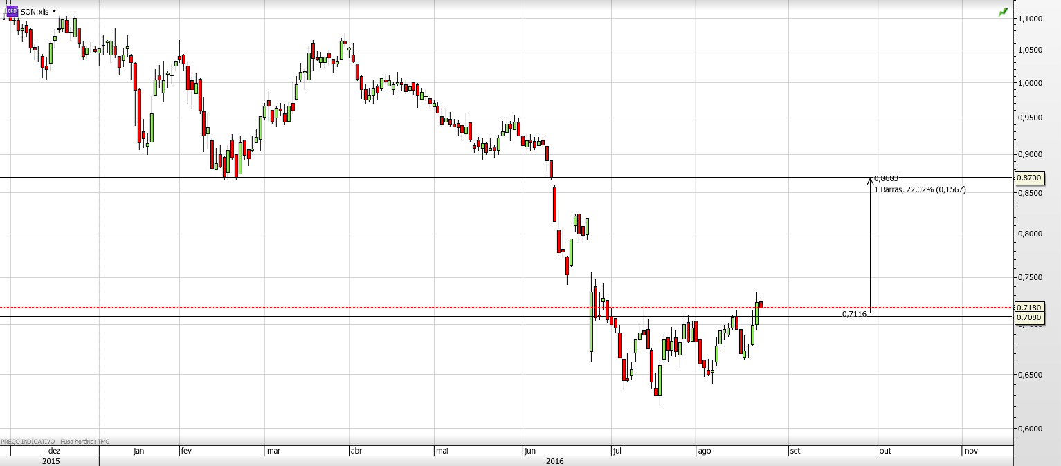 Curioso é que se tomarmos os 0.710 como resistência e os mínimos relativos que tem vindo a fazer desde 19/07 (19/07=0.621 ; 05/08=0.641 ; 17/08=0.665) está a formar uma cunha.