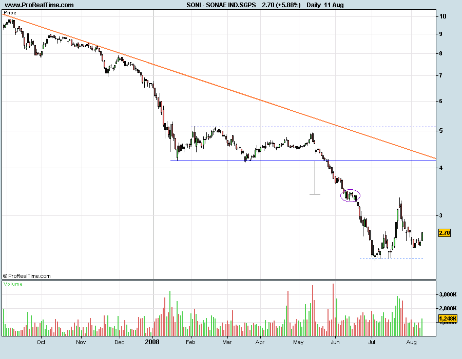 Pois, mas como já disse o AMR-bolsa, no curto prazo a soni está a dar sinais de subida e ontem ultrapassou uma pequena resistência de curto prazo nos 2,60, pelo que entrei na acção esperando que ela vá testar o máximo de há um mês...