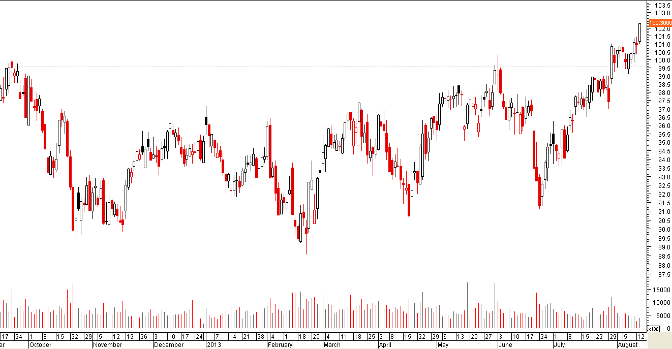Hoje cota nos 103,65 a subir 1,4% - aproxima-se dos máximos absolutos que estão nos 105,40.