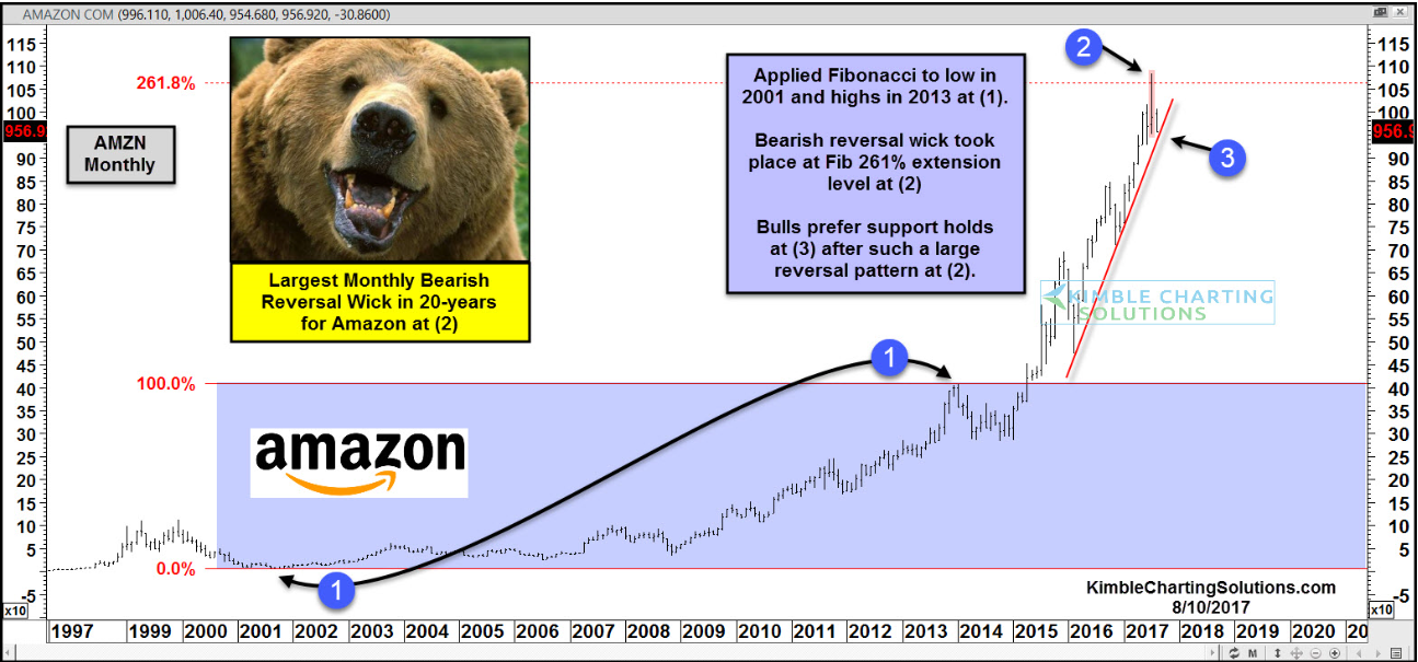 The Power of the Pattern applied Fibonacci to the lows in 2001 and highs in 2013 at each (1) and looked to see if any Fibonacci Extension level could come into play, that could impact the price of Amazon. The 261% Extension level came into play near the $1,007 level.