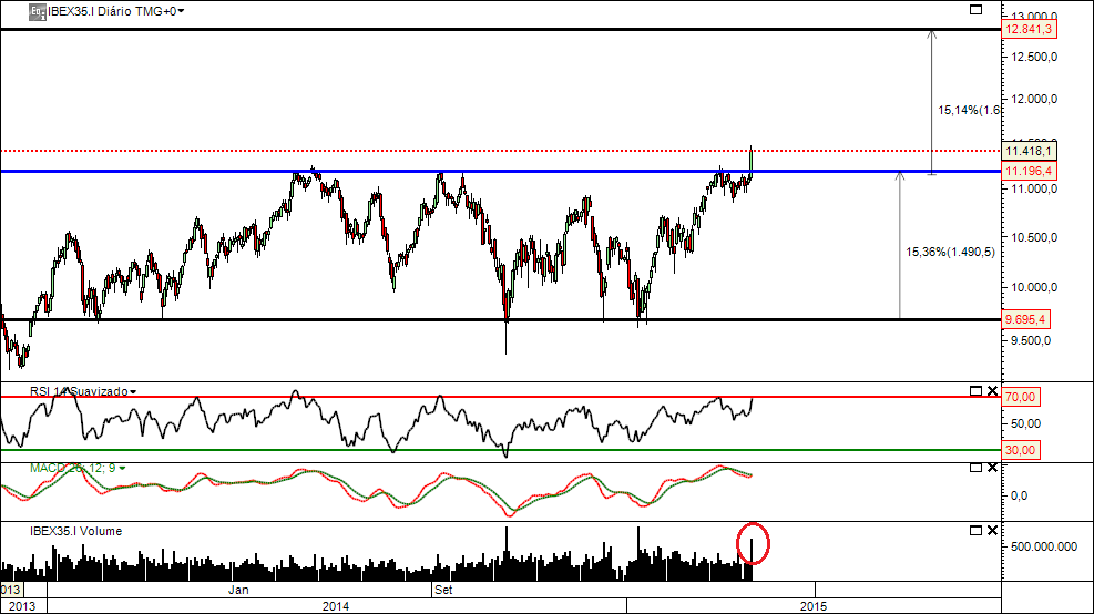 Ibex em máximos .. finalmente quebrou a resistência. Acho que o caminho é para Norte e tem potencial para galgar umas quantas centenas de pontos (tendo em conta que foi dos índices que menos subiu desde o QA)