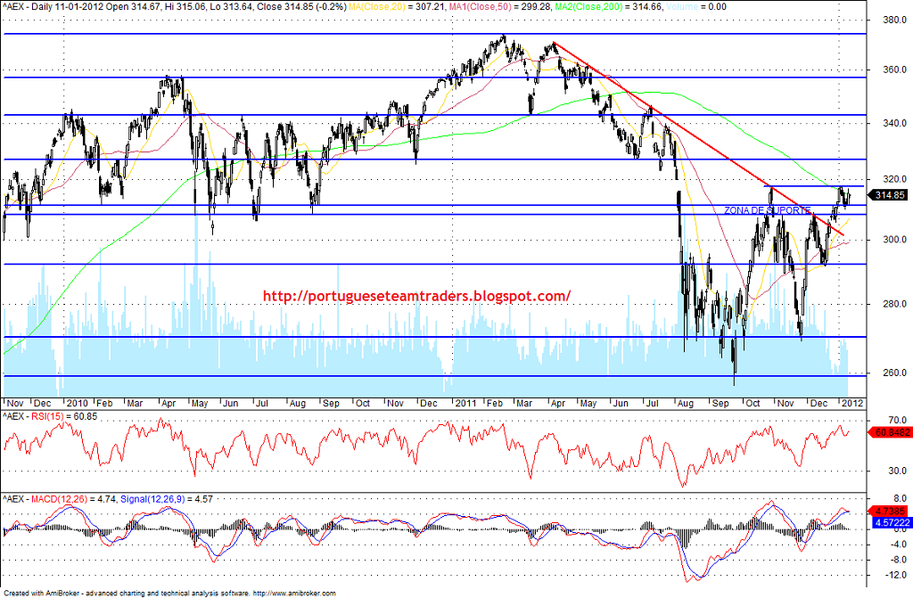 No curto prazo temos no AEX uma outra zona de resistência que está a travar as subidas de curto prazo os 317/318 pontos. Estou convencido que o AEX irá para onde o DAX for, por isso a probabilidade de termos uma ruptura das resistências seguintes é muito forte.