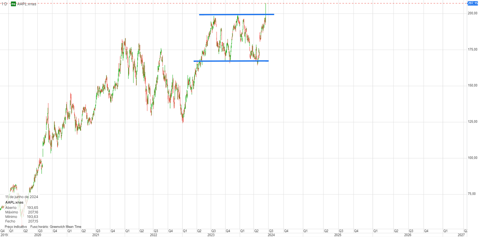 Muito interessante o comportamento da Apple. Depois de ter entrado curto (benditos stops) há umas semanas, porque parecia que estava a demonstrar fraqueza, eis que afinal estava a consolidar e arrancou para novos máximos