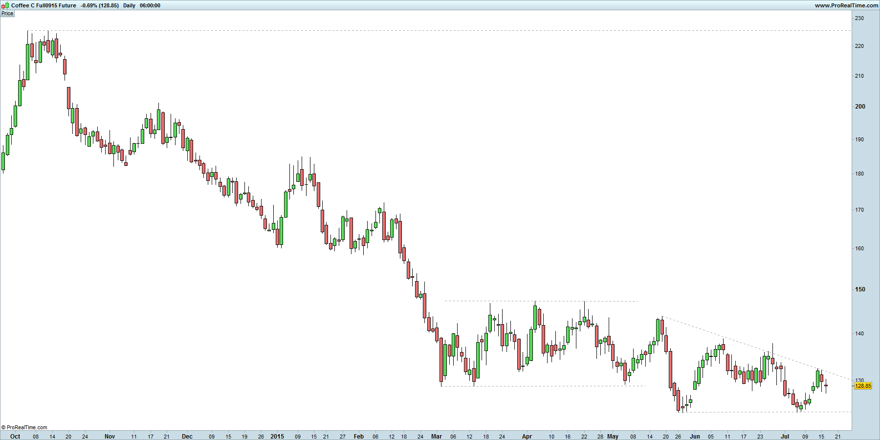 o café já está em queda há bastante tempo; contudo, para o curto médio prazo, avolumam-se as consolidações de continuação (da tendência anterior), na forma de um rectângulo e de um triângulo descendente