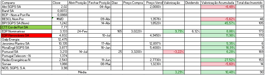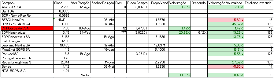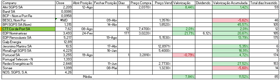Sexta-feira tive um pequeno rombo com os CTT, queda superior a 5% com um volume 25X superior ao volume médio dos últimos 30 dias, devido à noticia de que a parpública concluiu a venda de 31,5% do capital social dos CTT a desconto face ao preço de quinta-feira. O que valeu foi que as restantes cotadas tiveram uma performance positiva equilibrando a balança.