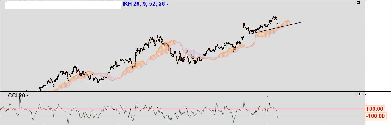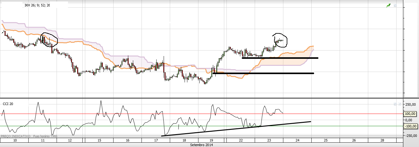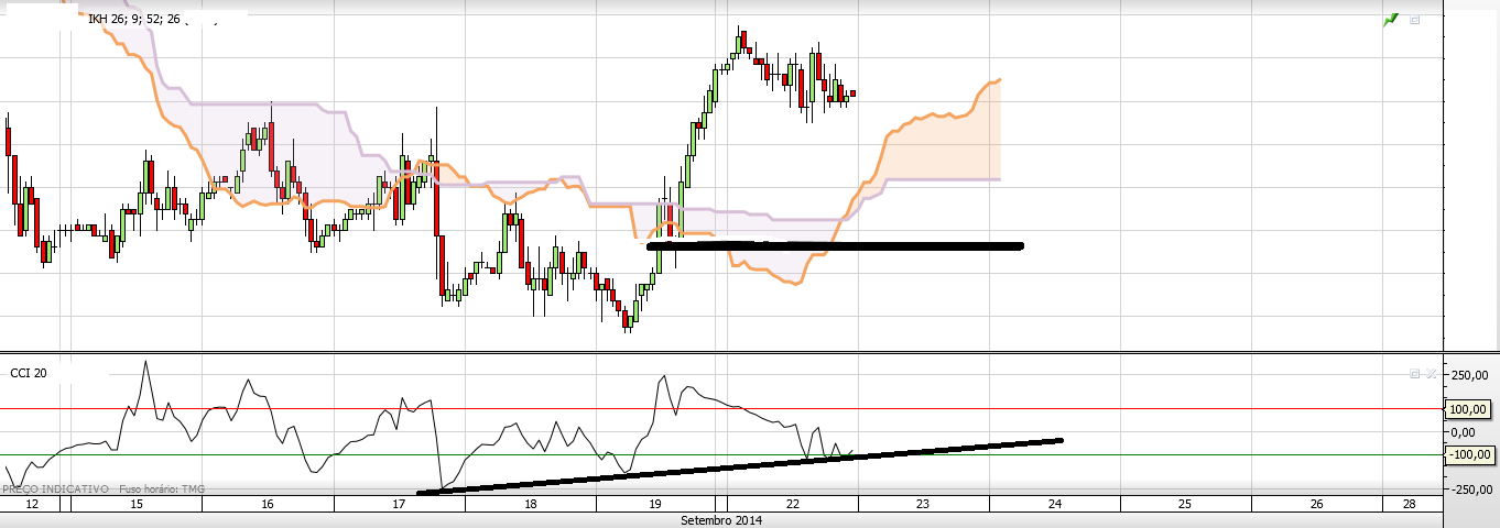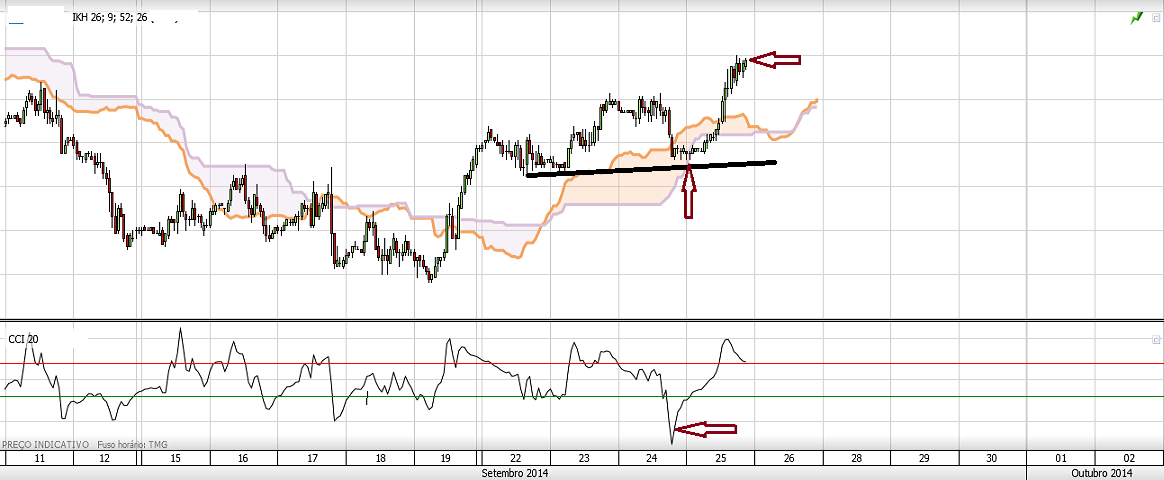 Os indicadores técnicos usados são o cci 20, a nuvem e linhas de tendência.