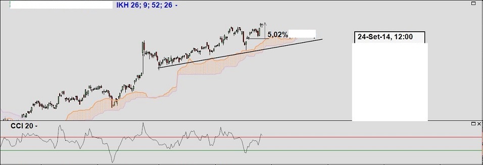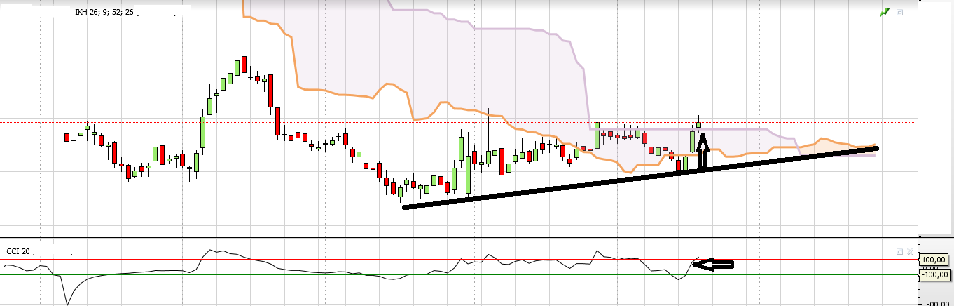 Seguindo os critérios mencionados (nuvem e cci 20) podemos ver que o preço desloca-se por cima da nuvem e o cci 20 sai da zona de sobrevenda. A nuvem no seu todo poderá dar-nos suporte. Também temos uma linha de suporte horizontal. Amanhá será dada ordem de compra do activo com os habituais parâmetros de lucro e stoploss.