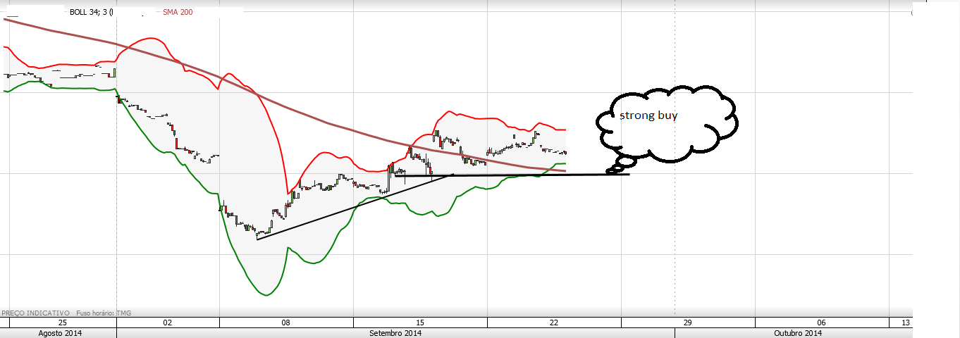 Gráfico xxxx: tendencia ascendente, contracão da volatilidade por cima da 200 mm, 200 mm e linha horizontal poderãao servir de suporte. Comprar o activo nos suportes com objectivo e stop mental nos locais desenhados.