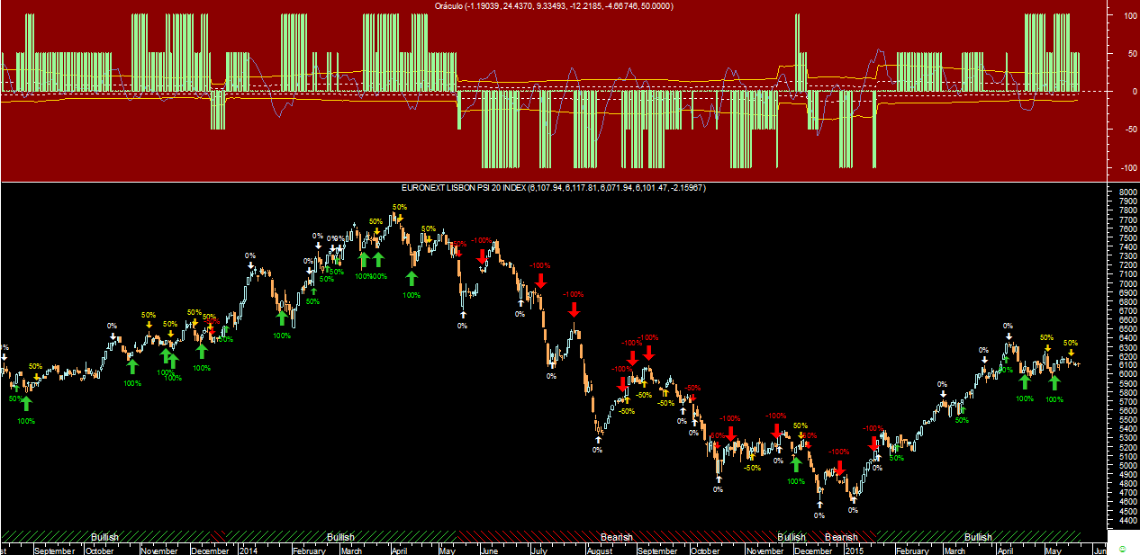 Como as imagens valem mais que mil palavras deixo abaixo ficar os exemplos do PSI 20 e do S&P 500 do novo sistema de trading, sem comentários mas com resultados muito promissores.