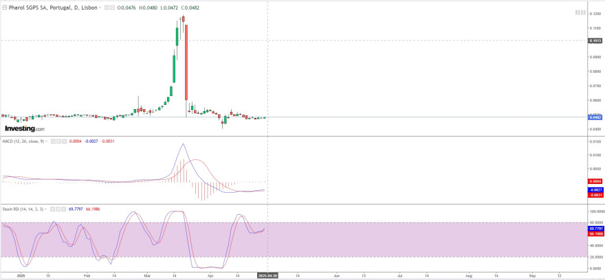 Não sei se o target que por aí circula, nos 21 centimos, será atingido, mas vejo na Pharol uma ação das mais seguras, agora que se criou um clima de medo para as ações e para as criptomoedas. Se desta consolidação nos índices partirmos em alta veremos o que faz a Pharol. Se formos para baixa dos 7 cêntimos dificilmente cairá, daí ser a minha única aposta, embora ainda na expetativa de poder voltar a 7, onde espero reforçar fortemente. Portanto estamos a 40% na Pharol e 60% em liquidez.