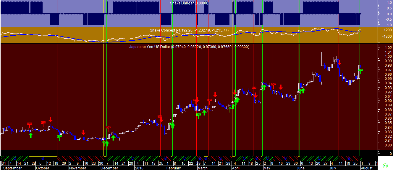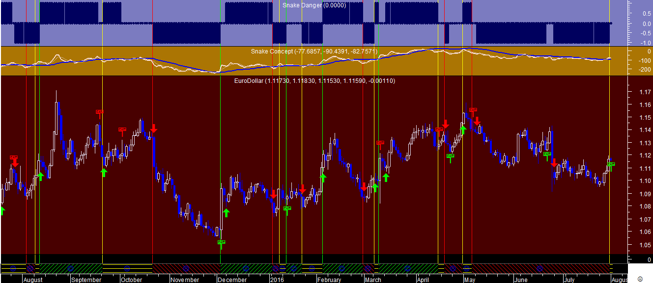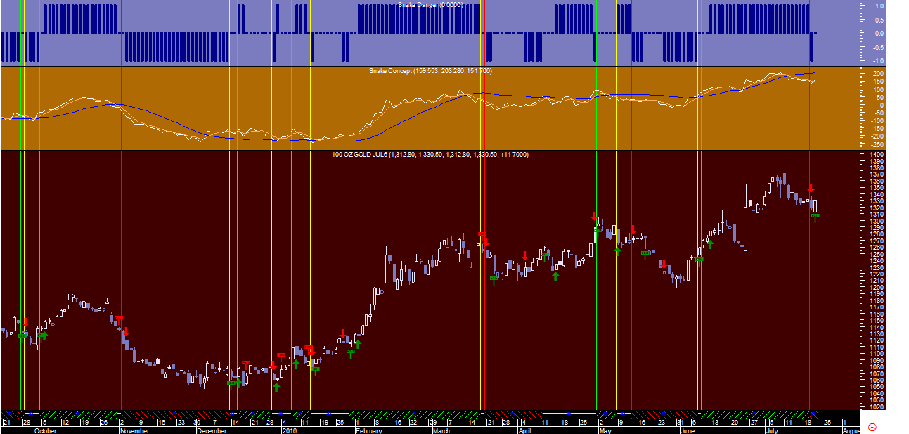 No gráfico do Ouro acrescentei hoje na parte superior o tal indicador chave do sistema de trading chamado “Rating Snake”, que analisa essencialmente as 2 vertentes do problema: o rating otimista, indicado pelo indicador verde bold e o rating pessimista marcado pelo indicador vermelho bold.