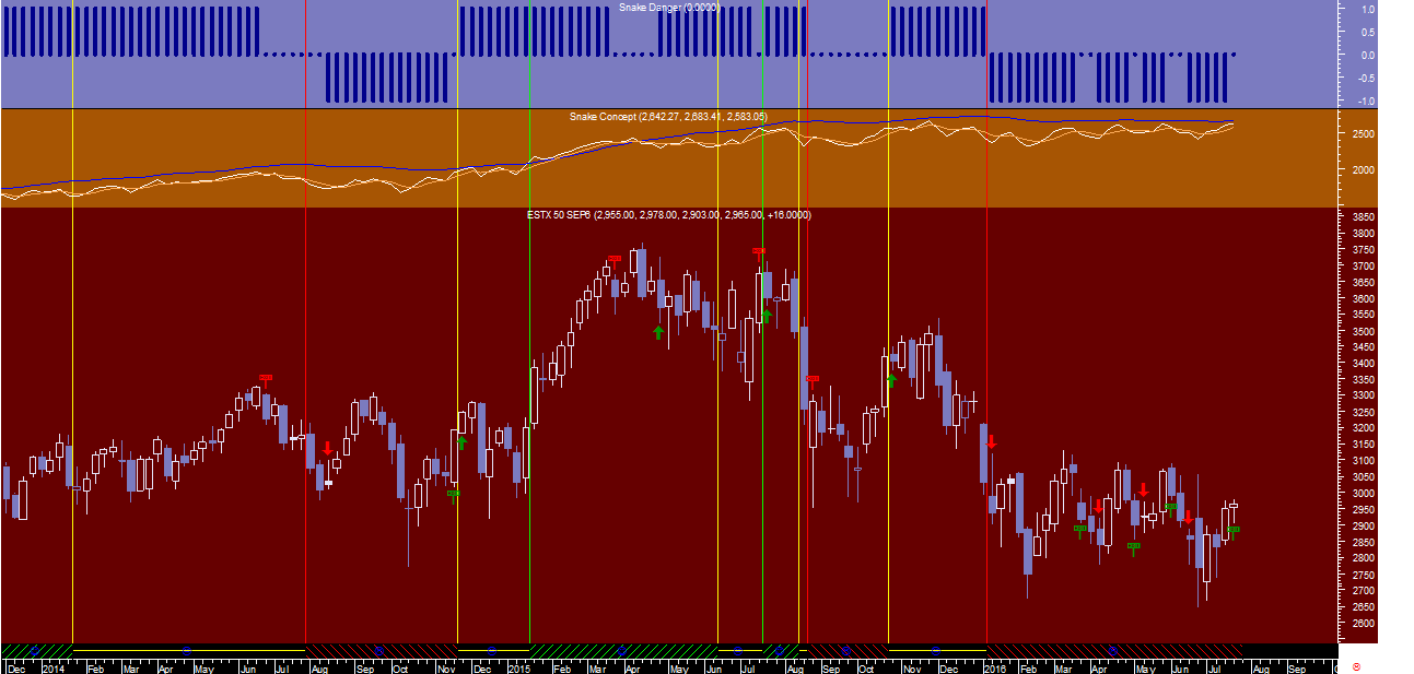 Estranhamente o sistema da “Cobra” refere que o regime preponderante nesta altura no Euro Stoxx 50 nesta escala mais longa é a ocorrência de uma tendência descendente, que terá sido detetada pelo programa em meados de janeiro deste ano.