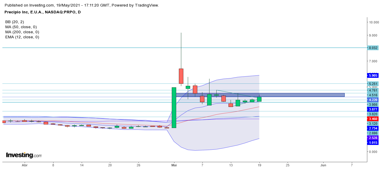 , a Precipio transacionou no dia 1,5X o nº total de ações em mercado (54M), volume de transações à grande e à Americana, tomada de mais valias no final da sessão baixou ganhos diários para 14%. Alerto para o after hours em que cai 7,4%