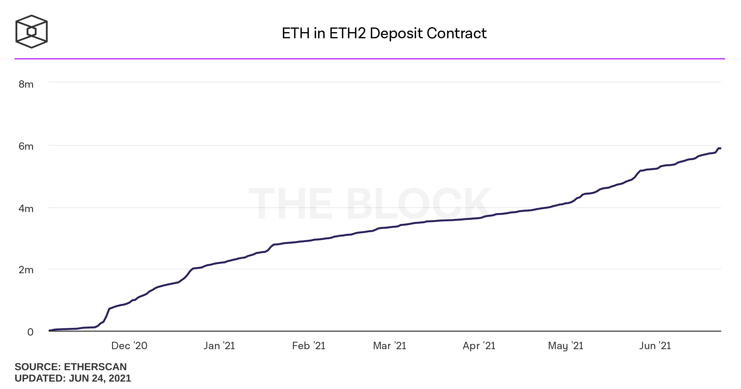 A quantidade de ether (ETH) em contratos de staking na rede Ethereum 2.0 atingiu a marca de 5 milhões, segundo o gráfico elaborado pelo The Block. A quantia atual no contrato é de 5,2 milhões de ETH, cerca de US$ 13,6 bilhões. Atualmente, um ETH vale cerca de US$ 2.630.