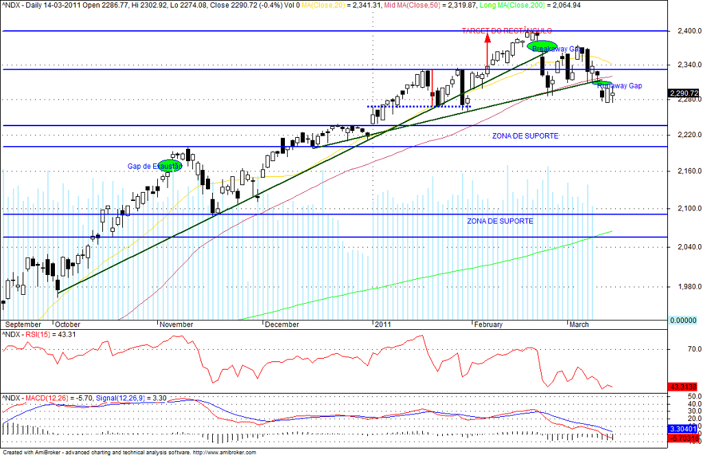 No dia 10 de Março (precisamente na véspera do terramoto), alertei neste tópico para a quebra da MMS50 e referi a possibilidade de se estar a desenhar uma cabeça-e-ombros no Nasdaq 100. Isto sugeria que os vendedores já estavam a tomar o controlo do mercado.