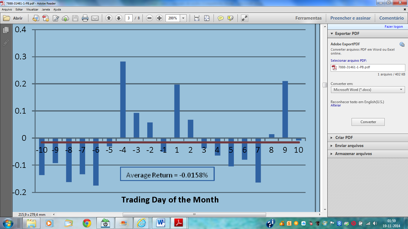 Em apenas 6 dias do mês, do dia -4 ao dia +2, tem-se o periodo de maior rentabilidade do investimento mensal. Mais de 70% dos ganhos mensais ficaram concentrados nesse periodo (face aos 20 dias/uteis/média do trading mensal) . Os principais motivos são: Um maior fluxo de investimentos nesse periodo devido à transposição de poupança salarial, dividendos concentrados nesse time frame e nos acertos de carteira de final de mês.