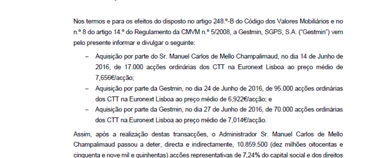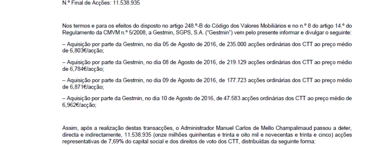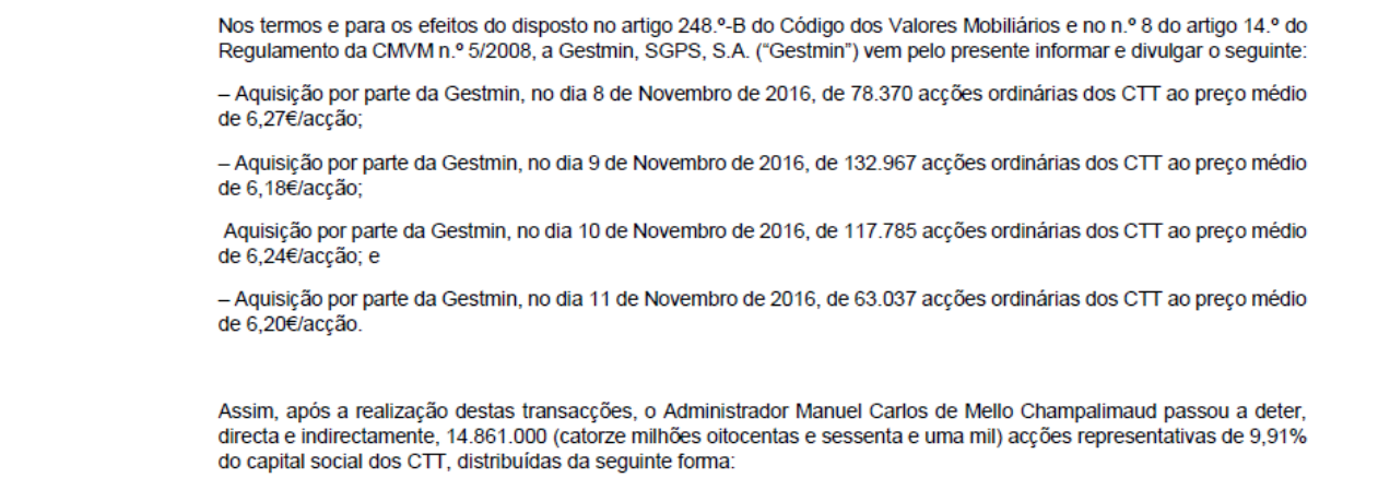 Àlvaro Escreveu:trend=friend, o que o Caixa BI diz a propósito de alterações na estrutura accionista deixa-me a pensar na possibilidade de algo mais profundo e por isso não haver já uma resposta da parte dos CTT para resfriar os ânimos aos curtos que continuam a dar-lhe forte e feio.