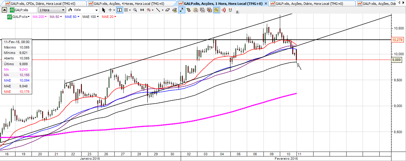 Ao mesmo tempo a Galp, que estava muito cara para os valores actuais do petróleo e do Euro, deixou de ter a sustentação da especulação à volta da apresentação de resultados e obviamente sofreu um esvaziar brutal especialmente a partir do momento em que quebrou os 10,27 (EMA 20). Como tinha dito o aproximar dos 10,185 (EMA 100) era um mau sinal e infelizmente confirmaram-se os meus piores receios. Terminou o dia a quebrar também o canal ascendente e isso não só é preocupante como indica que a queda se pode prolongar durante algum tempo e para valores muito mais profundos.