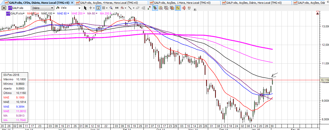 Relativamente à Galp, a partir do momento que quebrou a EMA 200 (9,7) no 4h, a próxima paragem era naturalmente a EMA 100 (10,18) no Diário e foi lá que parou também ao pip. Técnicamente perfeito em todos os cenários.