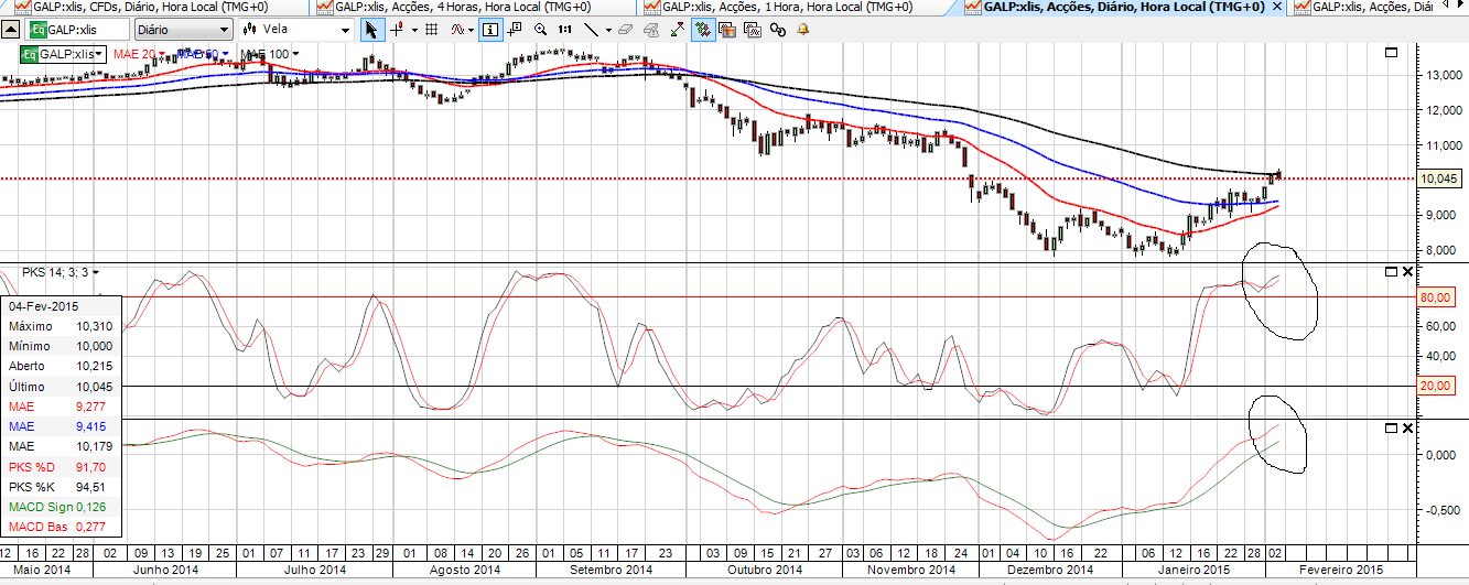 Tudo vendido a 10,44. Stand by para novas entradas mais abaixo. Stocástico hiperinflacionado, Macd muito elevado e ambos sincronizados. Riscos Grécia e Ucrânia. Risco elevado de queda do euro para 1,10. A Galp tem sido estoica em suportar-se independentemente do que se passa no mundo mas agora sem o suporte da apresentação de resultados prevejo o regresso à normalidade. Continuo a estar longo mas a preços mais realistas.