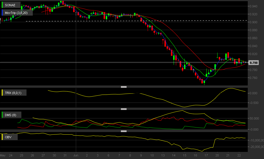 Boas tardes colegas,deixo o grafico da sonae de curto prazo em que penso estar a acumular para rebentar para cima,avaliando o OBV.Pelos indicadores encontra-se actualmente lateral com o ADX a perder cada vez mais força(carateristico nas lateralizacoes),no entanto gatilhado já na compra.Assim que houver acelaraçao deste indicador,temos o sinal de compra ou venda.Cenário comum a todas as acoes neste momento.Nao esqueçer que a tendencia no diario e semanal está carregada de venda,tratando-se pois,de um mero ressalto para já,que creio atinjir a zona dos 0.90cts