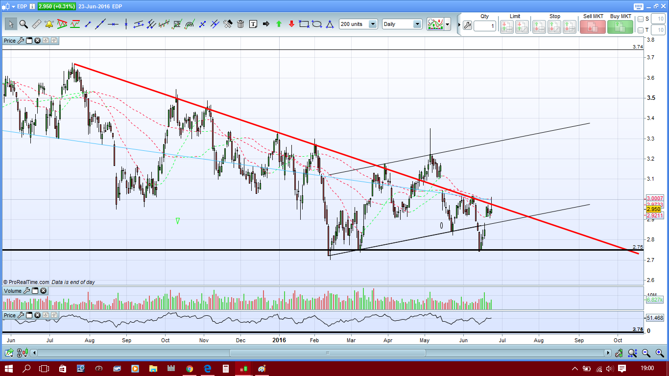 Hmm... parece-me que hoje a EDP quebrou a linha de tendencia ascendente que vinha a seguir desde os minimos do brexit: