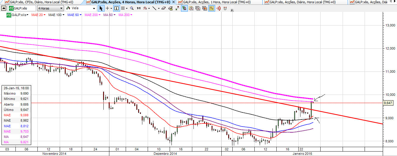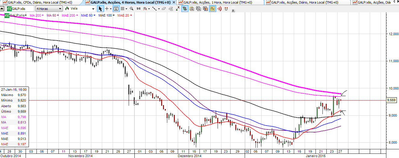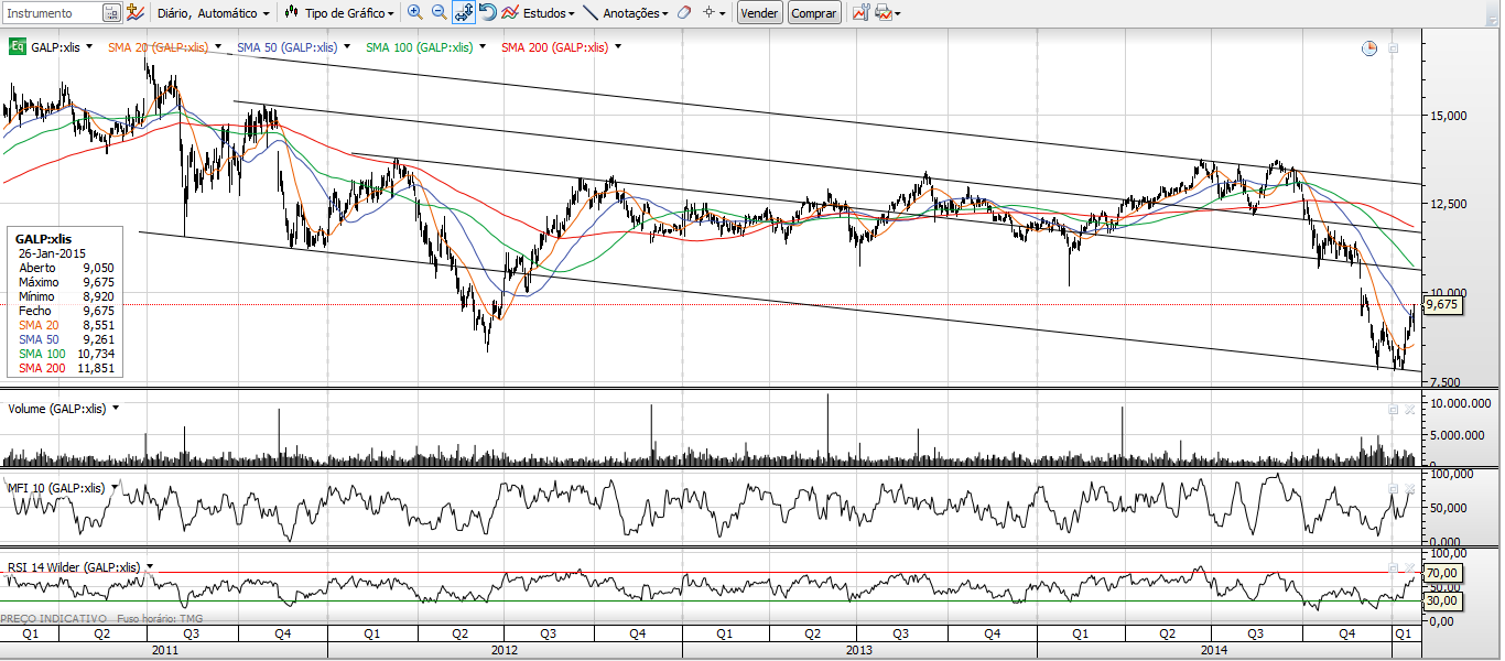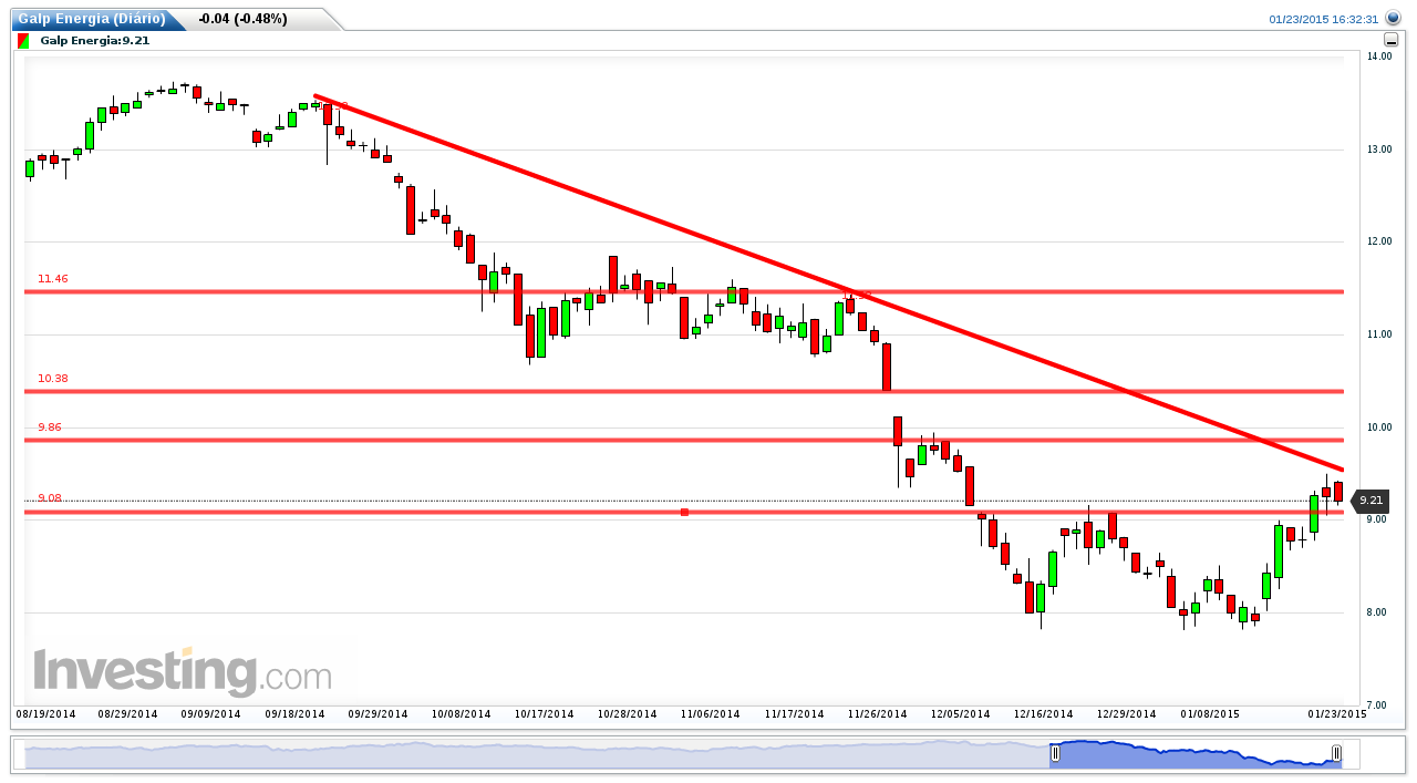 No seguimento do que venho dizendo há uns dias (o preço não é sustentável a este nivel com o petróleo tão baixo e o euro a niveis baixissimos), vendi tudo o que tinha a 9,20 (100k). Estou a acumular desde então outra vez. Acredito numa descida mais ou menos profunda conforme o preço do petróleo. O petróleo está no limite minimo e se quebrar pode ir aos 35-40$ pelo que se abre mais uma excelente oportunidade de acumular. Quebrou a EMA 50(9,30) e a TL UP de curto prazo e para mim o próximo degrau é a EMA 20 (8,76). Acredito que a sustentação actual se deve mais à proximidade do anúncio dos resultados do 4ºT do que a outra coisa. Minha sugestão: ir acumulando mas com calma pois 9,00 não é propriamente uma pechincha para quem há 2 semanas estava a 8,00 com o petroleo a niveis ligeiramente superiores ao actual e euro muito mais elevado.