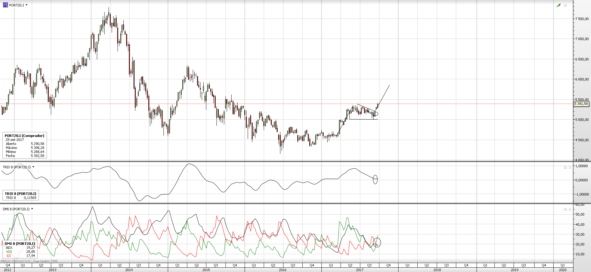 O psi20 continua bull, pelo semanal rompemos em alta um triangulo ascendente, temos agulhada de compra nos indicadores que indica nova pernada de alta a formar-se.