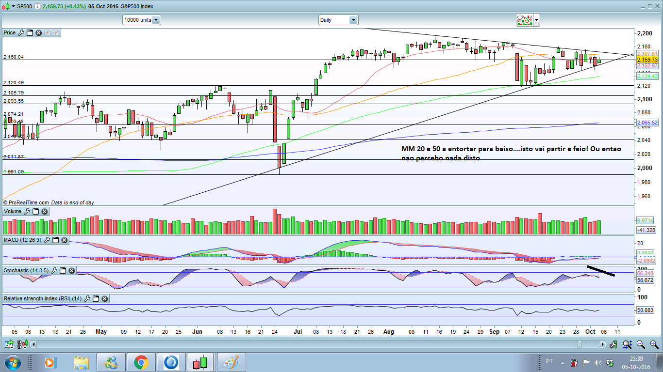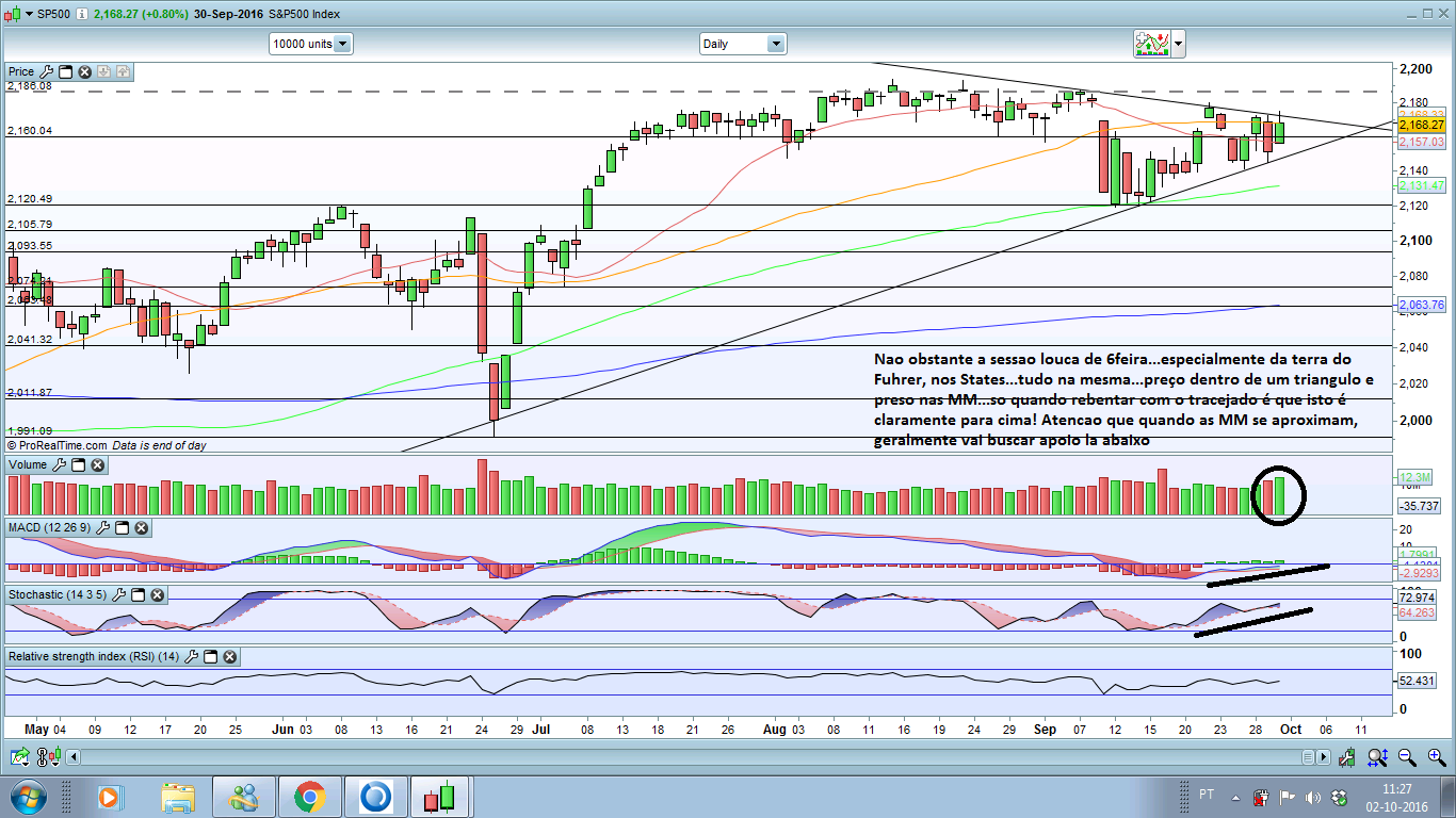 sigo alguns indices importantes para os meus trades em xau e xag. e o sp500 é um deles. assim, vamos ter o lançamento do indicador NFP dos USSA na sexta, que como de costume é um circo se a previsão não bater com o valor lançado. por outro lado, com a eleição do presidente, não se mexe nos mercados, yellen hawkish em setembro, pois pois, qualquer choque/escândalo pode virar as sondagens para o lado do trump, e o mundo acabava etc & tal.