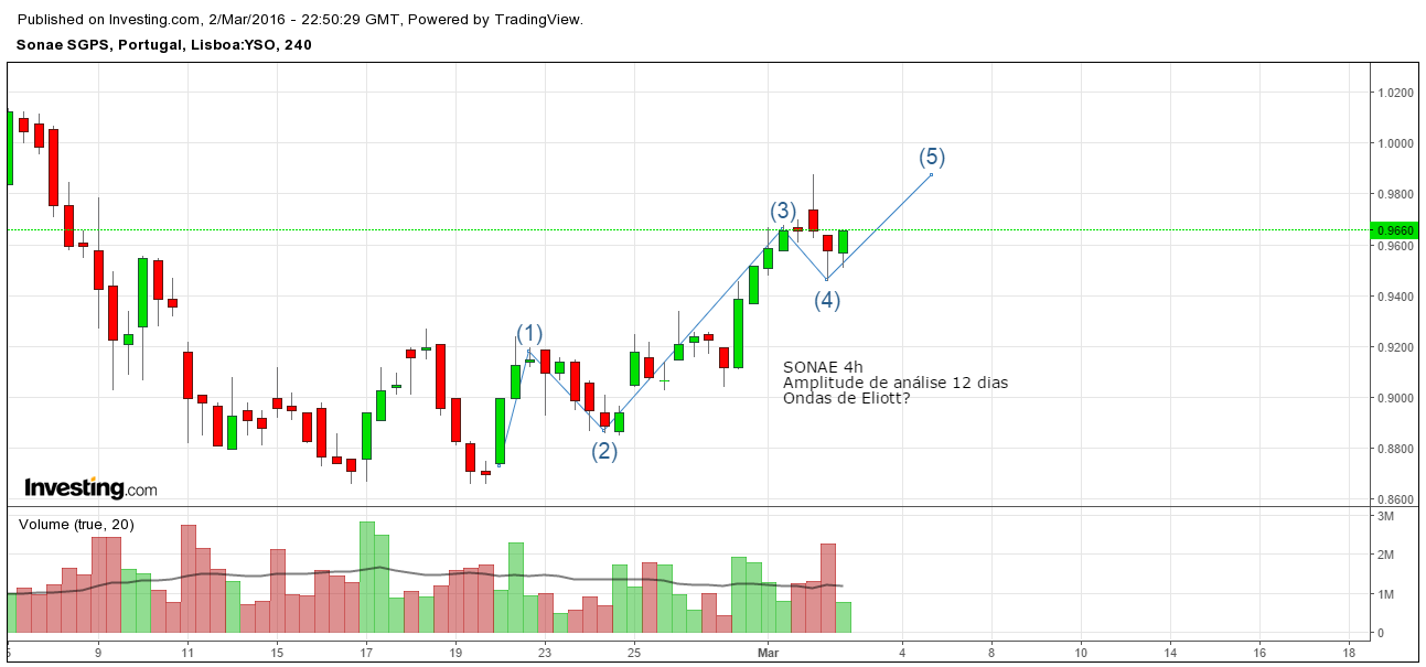 Não sei o suficiente para afirmar que se podem detectar as 5 ondas de Elliott accionadas pelos números de Fibonacci no gráfico da SONAE a 4h. Até porque muitas vezes vemos aquilo que queremos ver. A dimensão é de apenas 12 dias: a primeira onda começa a 872 e termina a 918; a segunda baixa até 887; a terceira, a mais longa, vai aos 966; a quarta desce a 947; e a quinta é capaz de se estar a formar agora. Querem os especialistas ter a paciência de examinar o gráfico anexo e deixar uma opinião?