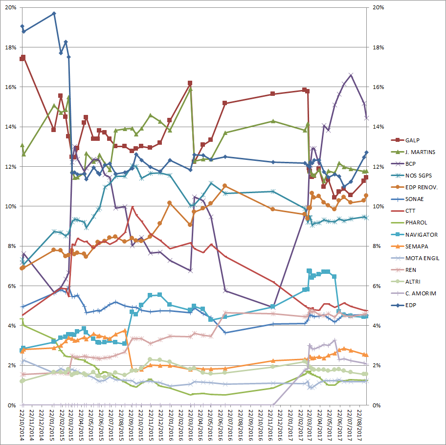 EAGLETRADER20 Escreveu:MarketGodzilla Escreveu:Lembro-me de se ter falado nisso na altura do rebalanceamento do índice, mas por que é que afinal o BCP mesmo sem ser a cotada com maior capitalização bolsista, é o que tem maior peso no índice?