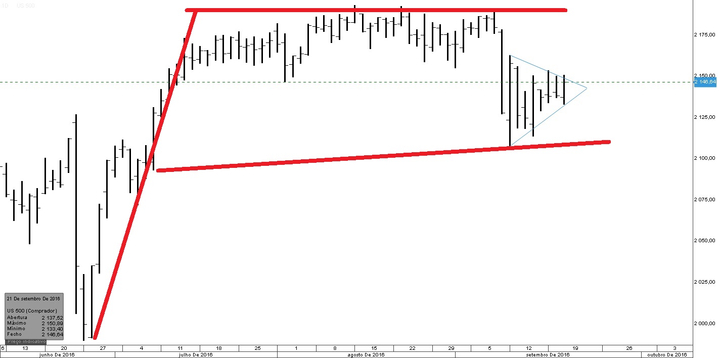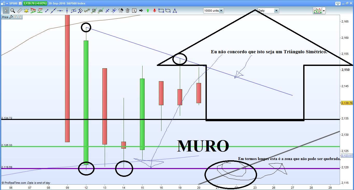 Eu não concordo que exista um Triângulo Simétrico no Índice e muito menos uma Bandeira. O que existe, para mim, é uma Wedge gigante e que há-de quebrar em baixa (um dia, na minha opinião) mas, não hoje.